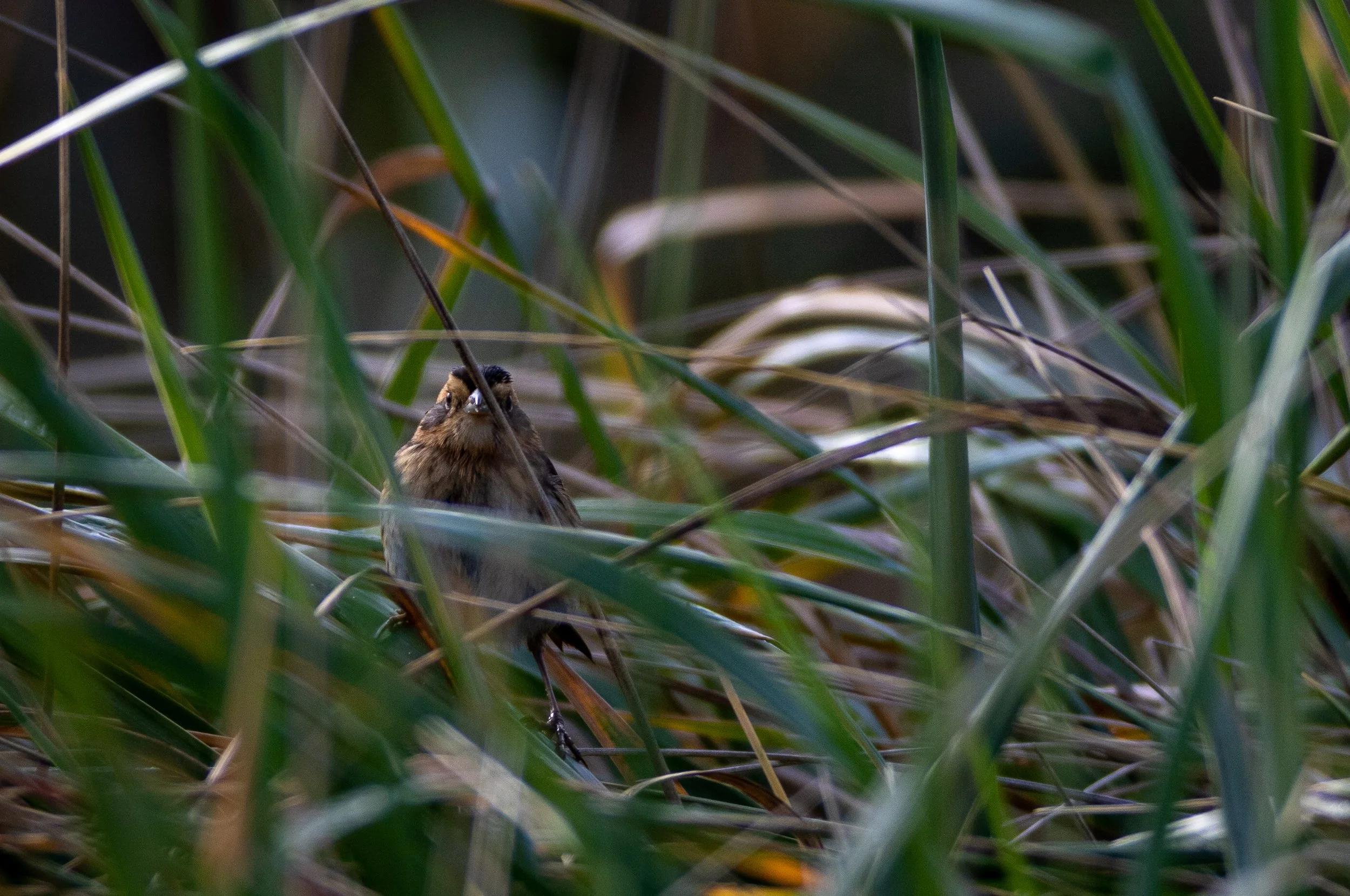 The Nelson’s Sparrow, who was making the Snow Bunting look like old news, would jump back and forth foraging in the beach kelp and grassland area about every 15 minutes, and only stick his head out sporadically. A challenge to photograph whilst navigating the foreign birder/bird photographer etiquette. I sat there for several hours and got about two photos worth showing.