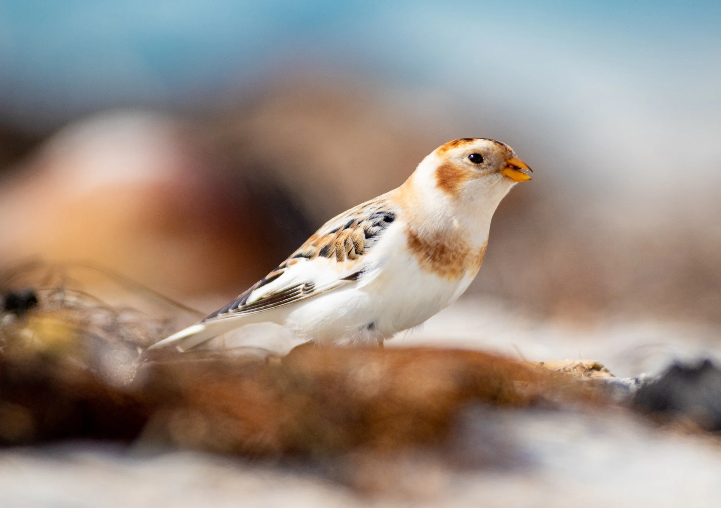 Exactly one year later, my birding déjà vu would culminate back full circle at EMT class 2022. Here I was with My Mentor once again, except this time with a newfound awareness, understanding, and some level of street cred from having seen some “lifers“. One day during a lunch break, a little birdy (sorry I had to) told us that there was something special hanging out on the beach. A vagrant bird from very far away. When My Mentor heard the news he was truly excited. But our hopes for it still being there were flattened by our busy schedule and hunger. So we decided to meander to the beach to have a look after our bellies were full from the infamous Crocker dining hall. Low and behold, (and playing in the beach rack) was the Snow Bunting.